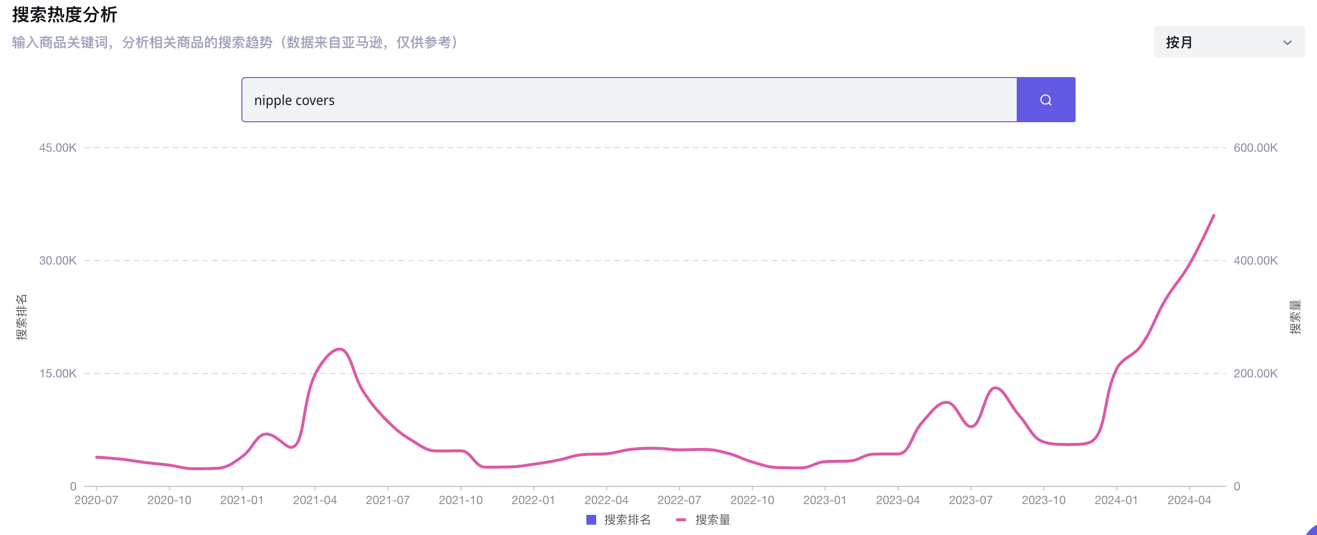 而在美国,选择不穿内衣的女性的人群也在与日俱增,特别是在炎热的夏季。不过,出于保护隐私和保护乳房皮肤的考虑,许多女性选择出门时使用隐形胸贴。根据EchoTik数据与Sif合作的最新功能——搜索热度分析,胸贴(Nipple Covers)这个名词近期在亚马逊搜索量产生大量提升。