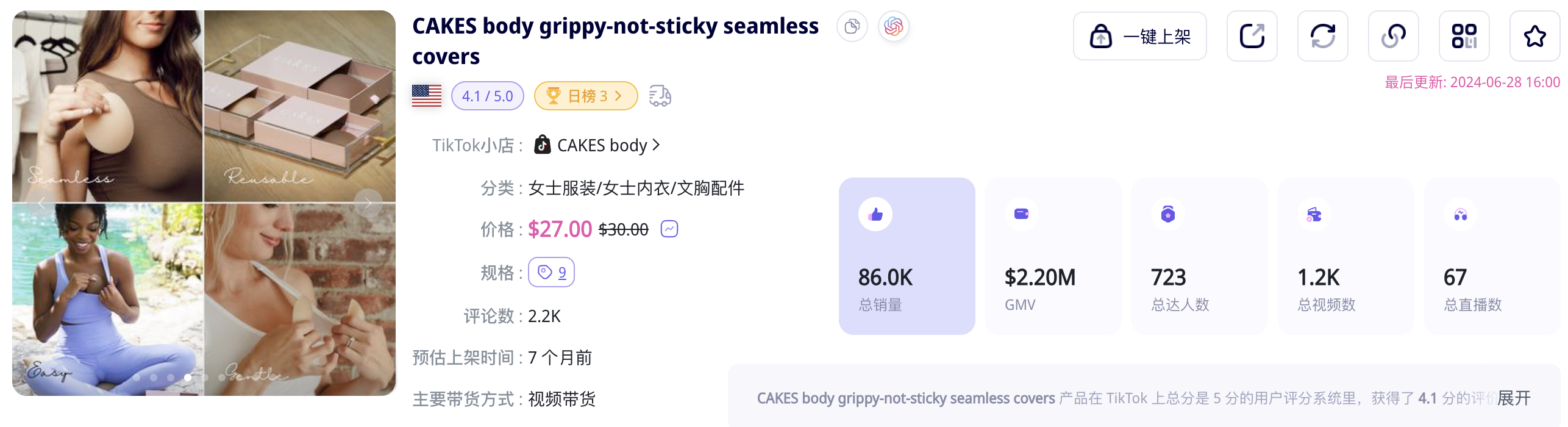 EchoTik数据发现:在TikTok Shop美国站,本土小店 CAKES body 的隐形胸贴在近期销量暴增:一对胸贴单价27美元,总销量近9万件,预估GMV达到220万美元。