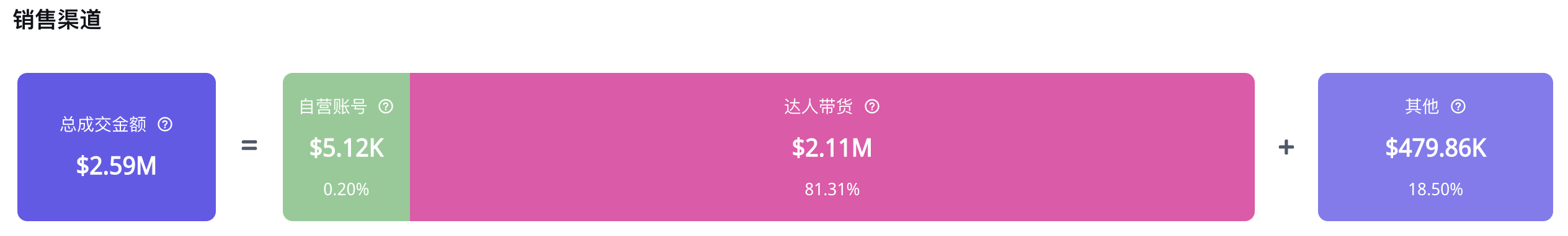 在运营方面上,据EchoTik数据的销售渠道分析,小店超过80%的成交来自于达人带货,方式主要通过达人短视频(73.54%),建联达人超过774人,总视频超1200件,并参与了直播带货71次。