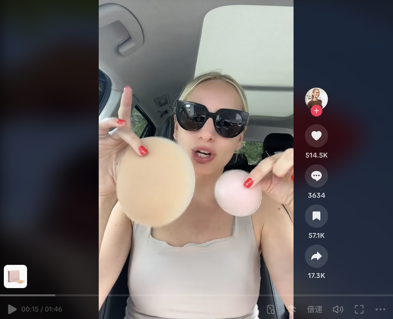 网红 @Taylor Capuano 是一个年轻爱美的白人女性,粉丝数量不足10万。她为CAKES这款隐形胸贴的代言,主要通过对比该胸贴与其他胸贴的形状、大小、粘性和体感舒适度等多方面,进而得出结论——CAKES的胸贴更加贴合胸型,美观舒适。这一条1分钟的口播视频成功为其带来超过千万的曝光率,以及1.8万件销量转化,预估GMV达到48.2万美元。