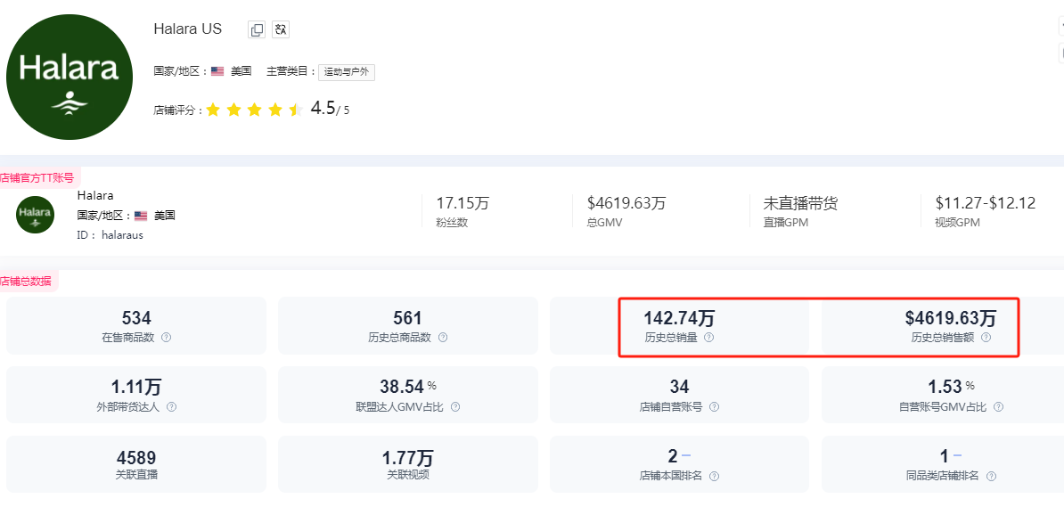 跨境电商的风越刮越大,海外扩张浪潮拍打得愈发猛烈,不少人瞄准了契机,搭乘上出海快船,在这条竞争激烈的赛道中成功找到正确航向。 快时尚品牌Halara便是其中之一。根据FastMoss的数据统计,Halara在TikTok美区开设了四家店铺,其中Halara US的销量自上架至今已经累积超过142万,历史总销售额高达4619万美元。