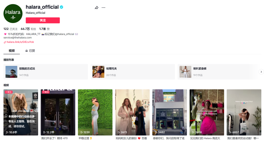 Halara的胜利是有迹可循的。自品牌创立之初,Halara就明确了其市场定位——将Halara的产品线锁定在年轻女性消费者群体,特别是那些追求健康生活方式、注重运动休闲的消费者。瞄准了这一市场空白,Halara以高品质、低价格的产品迅速赢得了消费者的青睐。 然而,仅有优质的产品还不足以让Halara在竞争激烈的跨境电商市场中脱颖而出。正所谓“酒香也怕巷子深”,因此要想打响招牌少不了有效的营销策略和渠道的助阵。 而TikTok在全球消费市场上的火爆程度,自然使得它成为了Halara出海的营销新战场。据了解,在TikTok平台上,Halara采取了多账号运营的模式,通过发布产品展示、变装、舞蹈等多样化的内容,吸引了大量年轻用户的关注。同时,Halara还与众多海外网红合作来提高产品的曝光率。这种“网红+短视频”的营销模式让Halara在TikTok平台上迅速走红。
