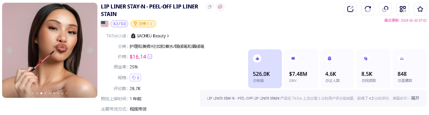 在欧美文化中,圆润丰满的嘴唇通常被视为女性魅力和性感的重要标志之一,为了迎合欧美女性的审美偏好,“Lip Liner Stay 可撕唇线笔”为消费者提供了彩妆新选择,只需沿着唇线或需要强调线条的部位轻轻涂抹,待产品成膜后撕下,便能勾勒出丰满圆润的嘴唇轮廓,营造出一种饱满圆润的视觉效果,后续与口红配合使用,还可以进一步满足消费者对于唇部彩妆的需求。 在成分上,该唇线笔采用对嘴唇无害的配方,同时蕴含唇部护理成分;在颜色上,提供了棕色、裸色、紫色等5种颜色选择,满足消费者对于不同场景的彩妆需求,大大提升了用户的购买欲望。 而“Lip Liner Stay 可撕唇线笔”之所以在 TikTok 美区热销,除了产品本身迎合了消费者对于饱满圆润唇部的日常需求,背后也离不开 SACHEU Beauty 创始人 Sarah Cheung 的出色运营。01
