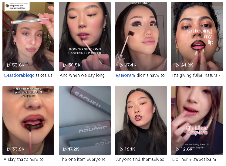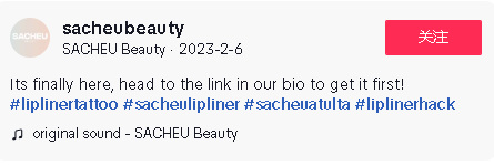 在产品推出前,Sarah 在品牌的 TikTok 账号 @sacheubeauty 进行了官宣,随后也将营销重点放在了该款新品上,得益于用户之间的相互推荐以及Sarah本人在分享护肤和美妆心得时的产品植入,“Lip Liner Stay 唇线笔”在 TikTok 上慢慢积攒起了一定的热度,视频观看量和点赞数节节攀升。
