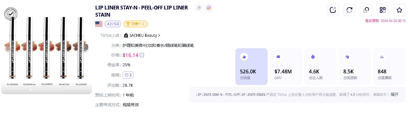 2023 年 6 月,在 TikTok 美区小店掀起热潮时,SACHEU Beauty 果断入局开通小店抢占市场先机。凭借入局早期大批量进行达人建联,SACHEU Beauty 快速在美国市场提升了品牌影响力,事实证明,这一策略确实有效。即便是现在,SACHEU Beauty 依旧凭借达人带货实现了大额收入,在过去 180 天内(2024.1.4-2024.7.1),联盟达人为店铺贡献了超 95% 的 GMV 占比,相较之下,自营账号和商城的贡献似乎不足为道。 而在店铺售卖的所有商品中,数“Lip Liner Stay 唇线笔”的销售数据最为瞩目。在过去几个月的时间里,该产品一直稳居美容护理类目前五名的位置,且目前仍保持着以强劲的销售态势。据 EchoTik 提供的数据显示,截止到 6 月 30 日,“Lip Liner Stay 唇线笔”总共售出超 50 万支,总销售额超过了 700 万美金。