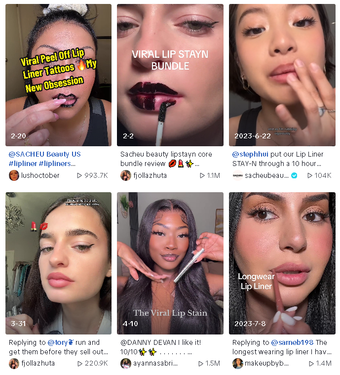2022 年 6 月,Sarah 在自己个人的 TikTok 账号发布用美宝莲眉笔留下性感唇线的视频,在网上疯传几天后,观看量达到了 380 万。Sarah 和团队随即意识到这是个商机,并开始着手开发一款原创的唇线笔产品。在对产品进行六个多月的测试后,SACHEU Beauty 在 2023 年 2 月 6 日正式推出了唇线笔 Lip Liner Stay-N,也就是前文我们提到在 TikTok 美区热卖的产品。