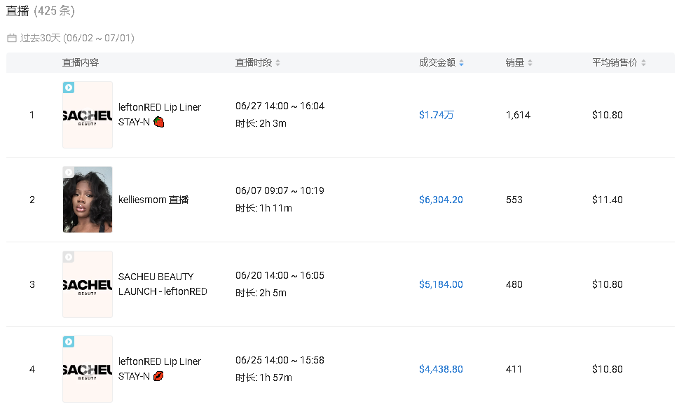 不仅如此,SACHEU Beauty 还抓住了美区直播电商这一风口,与多个达人合作进行直播带货,在过去 30 天内(2024.6.2-2024.7.1),产生了 425 条直播记录,面对镜头,主播直接上嘴无死角展示唇线笔的质地、顺滑度、显色度、方便度等效果,为店铺带来了 10 几万美元的销售额。