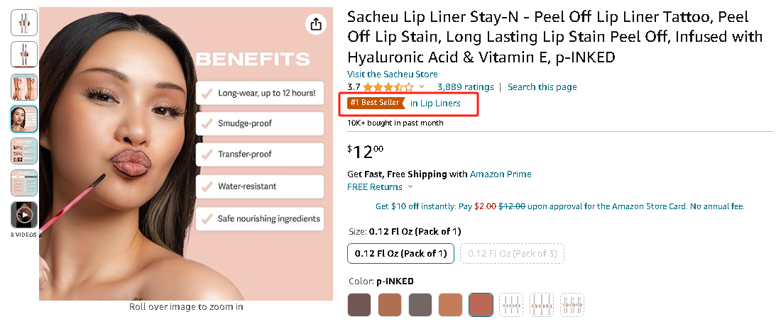 得益于“Lip Liner Stay 唇线笔”在 TikTok 上产生的显著影响力,所带来的流量外溢也源源带动了其亚马逊店铺同款产品的销售。可以看到,目前该款产品在亚马逊商店登上了唇线笔类目 BestSeller 第一名,单月销量超过 1 万件。在商品的详情页里,我们甚至还能看到 SACHEU Beauty 特意展示了品牌的 TikTok 账号,从而达到两个平台之间相互引流的目的。