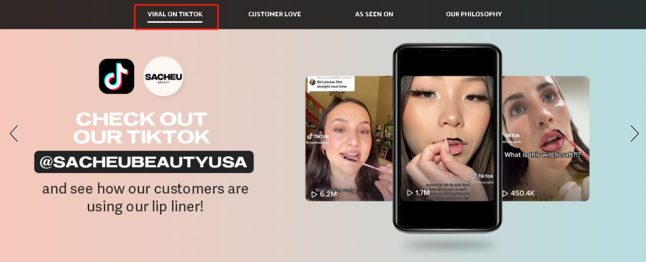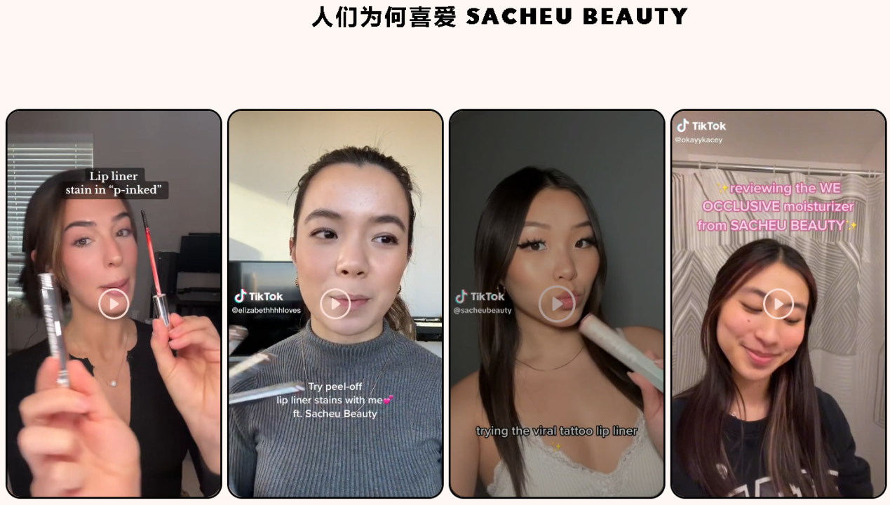 在细节的设计上,SACHEU Beauty 在独立站首页设置了 TikTok 达人关于产品使用视频的版块,视频自动播放的形式不仅能有效吸引消费者的目光,以此来增加他们在网站停留的时间,还能借视频让消费者对产品产生一定的认知,在了解产品特色后基于对达人的信任程度提高对产品的购买欲望。