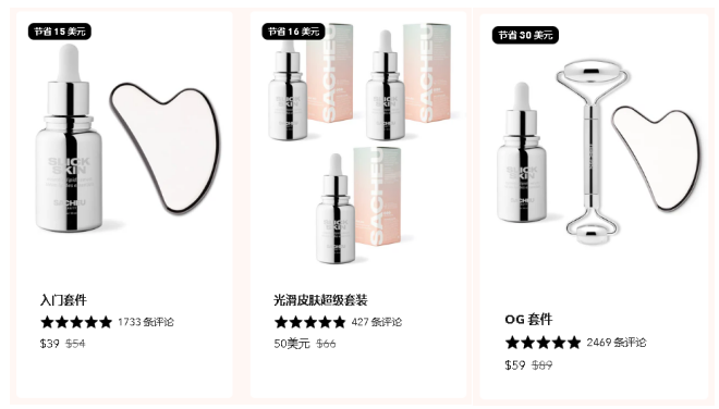 在定价上,SACHEU Beauty 不仅为新用户提供了 10% 的折扣优惠,还合理运用了捆绑销售的策略来提高客单价。 将配套使用的亮肤精华液、面部刮痧和面部滚轮这些核心产品进行不同组合的销售,例如,SACHEU Beauty 将亮肤精华液、面部刮痧定为品牌的入门产品,售卖价格为 39 美元,比起单独购买的价格优惠了 15 美元;而亮肤精华液、面部刮痧和面部滚轮组合销售价为 59 美元,优惠了 30 美元。 在产品页面上,SACHEU Beauty 清晰标注了每个组合套餐的价格优势,激励用户点击购买,对比之下,由于捆绑销售的组合在价格上比单独购买单个产品更具吸引力,因此消费者往往更愿意选择。从消费者的角度上,可以轻松地获得相关产品的组合,更好地满足购物需求。在品牌的角度上,这种方式可以促使顾客购买附加产品,从而增加整体的销售额和利润。