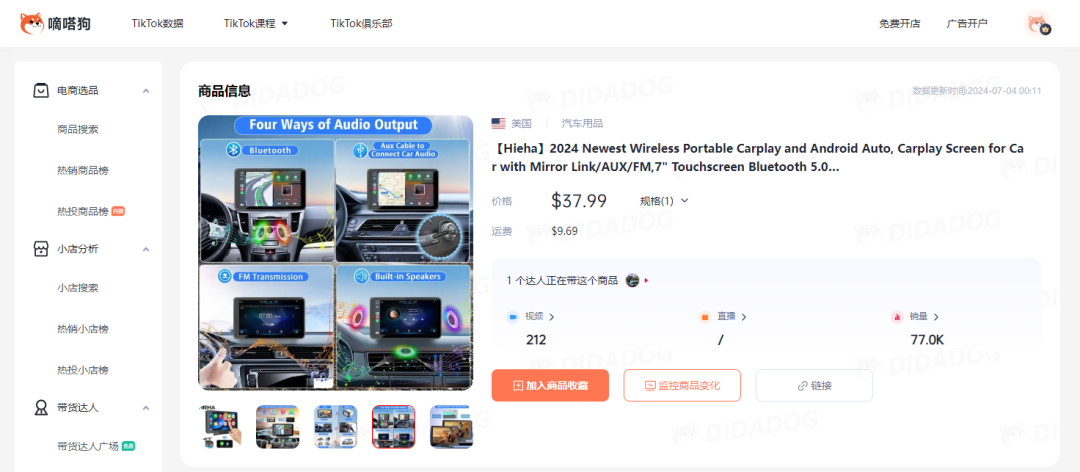 近期嘀嗒狗检测到一款十分畅销的车载屏幕,吸引了大量用户。商品上架之后,在美国小店卖出了7.7万单,单品售价为37.99美刀。