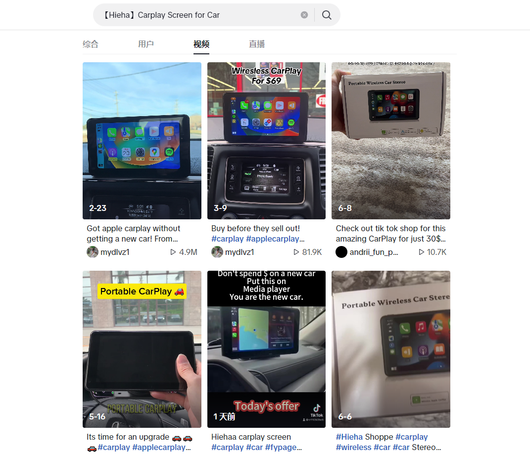 通过搜索商品关键词“Carplay Screen for Car”可以看到相关产品的推广视频,TikTok上关于该产品的测评视频分别使用了不同的车辆,博主们通过各种车辆完美适配的结果,向我们充分地展示了这款车载屏幕的泛用性和便捷性,不管是什么款型,什么年代,什么品牌的车,只需要取出产品,一粘,一插即可快速完成智能化升级。试问这样帅气实用的车载屏幕哪个车主不想拥有一件呢。