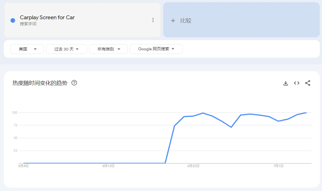 通过Google Trends我们可以看到在一定时间内,产品关键词在搜索引擎上的搜索热度和市场趋势。在输入产品关键词“Carplay Screen for Car”后,我们可以看到,相关搜索热度在6.19日开始大幅上升,之后连续几日搜索量都较为平稳。