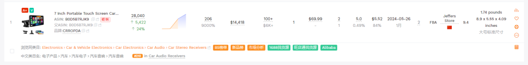 今天推荐的车载屏幕目前在美区的销量仍在持续上升,并且可以放心的是,近几个月车载用品市场前景较好,多款产品销量稳定,如果有想要尝试的商家可以选择此款产品入局。