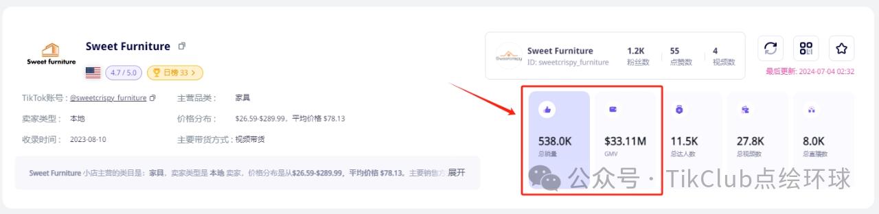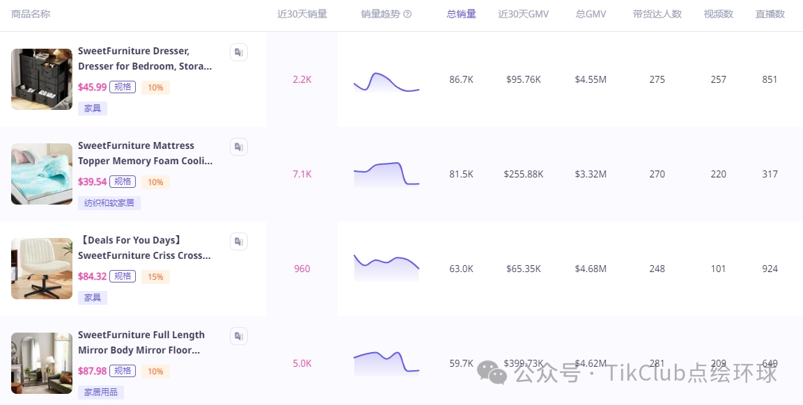 Sweet furniture在去年8月入局TikTok,但仅仅用了两个月时间跨境小白跃升家居行业黑马,登上了家具类目第一。而且不到一年时间,小店销售额突破亿元,成为了TikTok Shop跨境电商的亿元俱乐部商家。