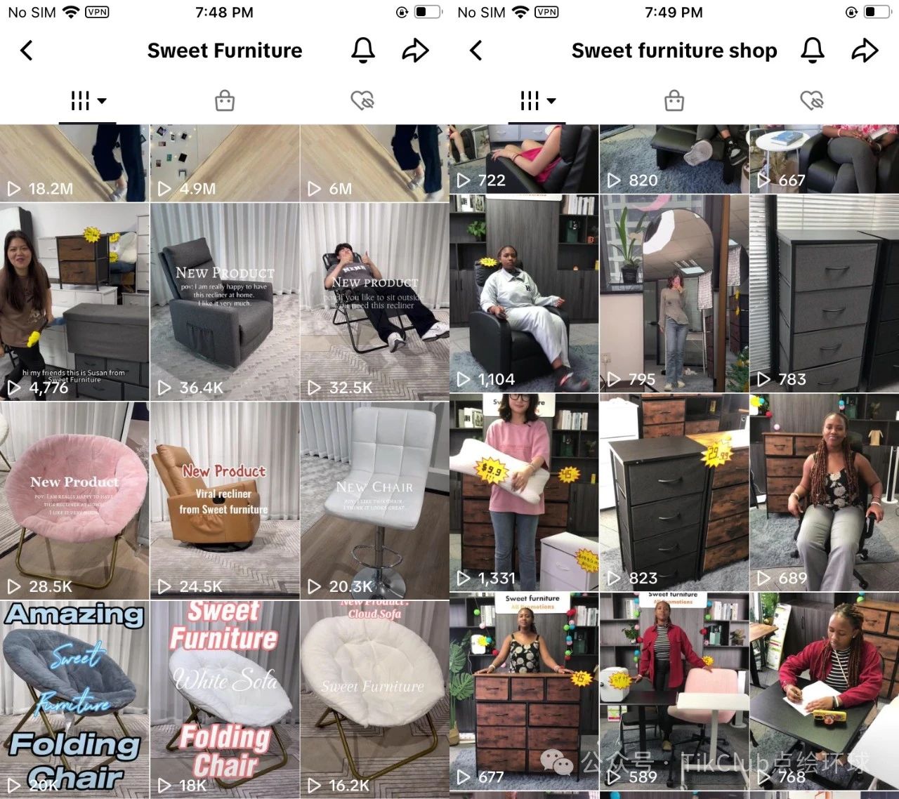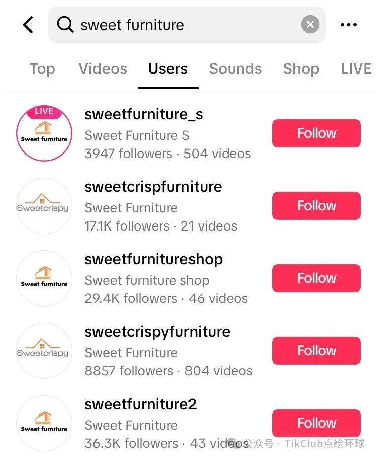 3.1 矩阵账号 Sweet Furniture在TikTok上构建多个自营账号形成矩阵,那就可以在多个账号的协同作用下,增加内容覆盖面,这样用户转化率也会更高。 而且自营账号,可以增强消费者对该品牌的信任度和忠诚度,账号主要内容还是展示产品及其不同的使用场景。