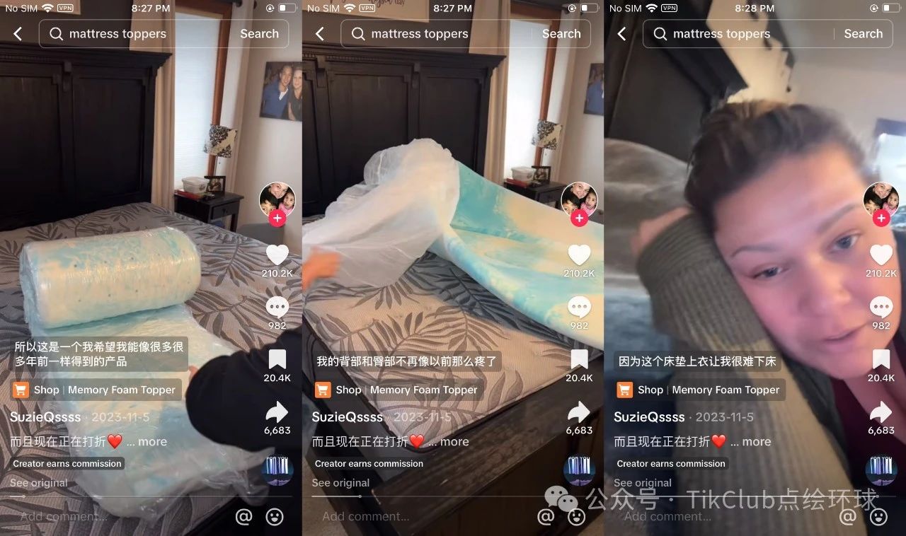 美区的腰部达人@suzieqssss其中一条44秒的视频,展示床垫的拆开与展示。博主最后还躺在床垫上表达真实感受。