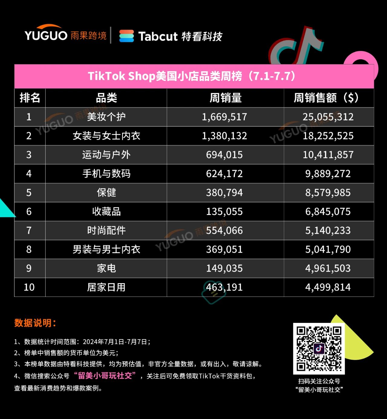 根据 Tabcut 特看提供的数据观察,本期美区品类 TOP 榜整体 GMV 高达 9868 万美元,总销量约 642 万件。