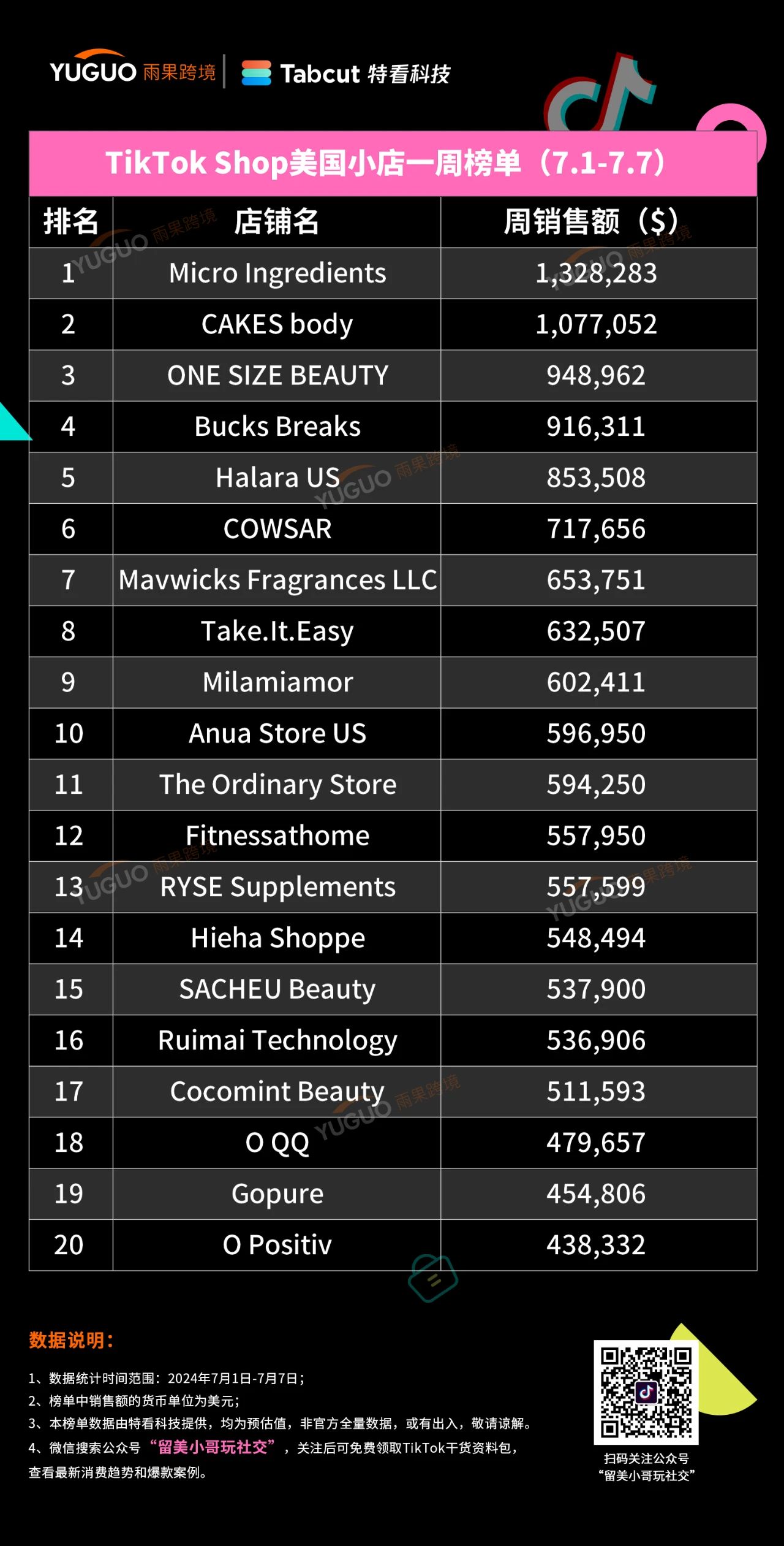 榜三小店 @ONE SIZE BEAUTY 本期周销售额达 948,962 美元,最高日销量数据是在 7-6 当天日销量 9440 件,日销售额 19.96 万美元。