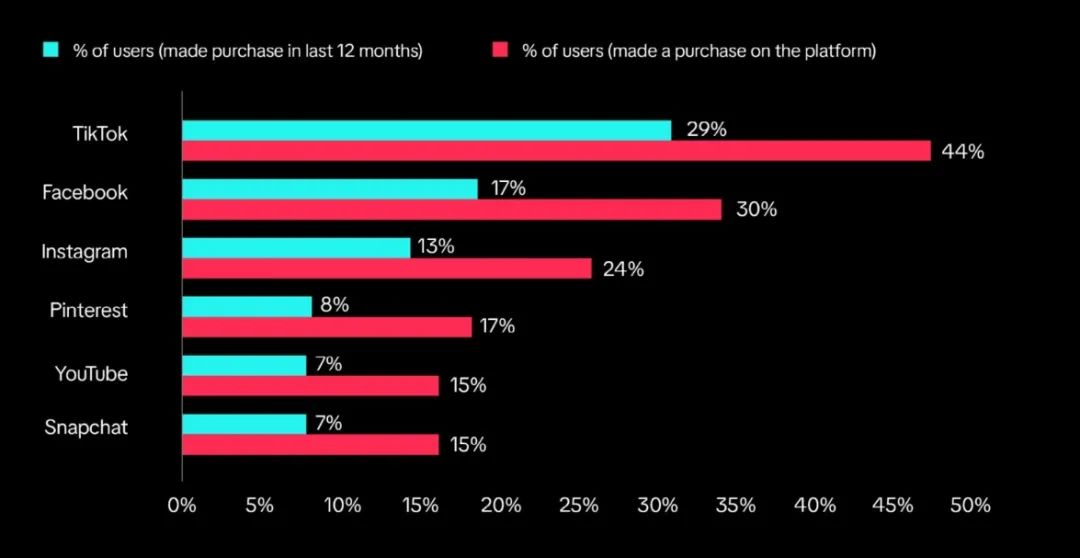 根据Retail Economics的报告数据,有超过半数的英国用户已经通过社交媒体平台进行过购物,而在TikTok上,这一比例更为突出,有44%的用户报告称他们曾通过TikTok Shop直接购买商品,而有四分之一的TikTok用户表示,他们每月至少在平台上购物一次。
