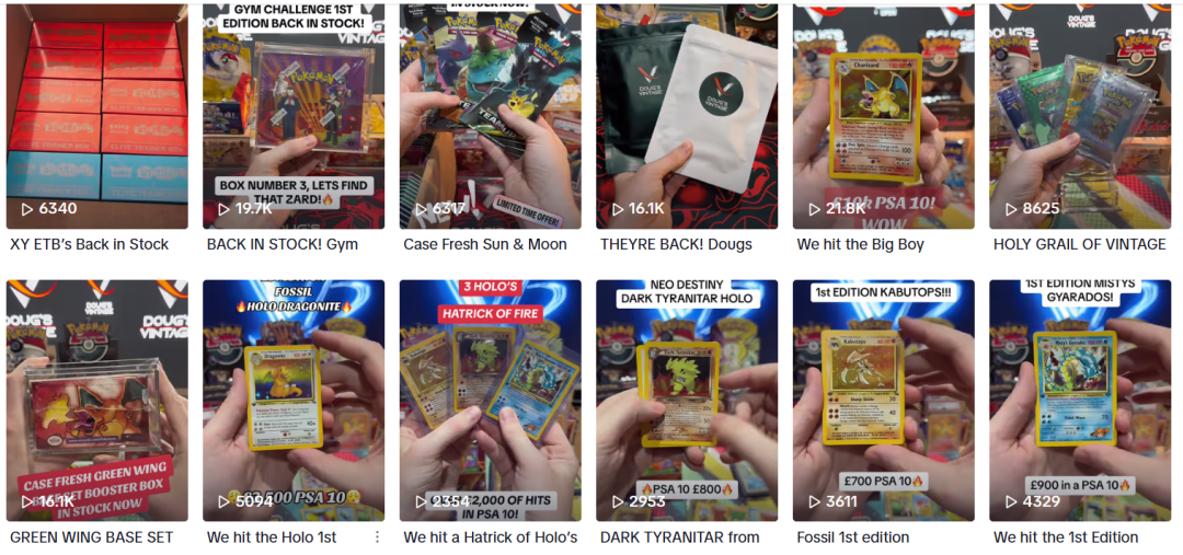 而以当地的品牌和卖家视角来看,TikTok引领的直播带货的模式,为小型企业和个人创作者提供了展示和销售产品的机会,这使更多小众和创新产品得以进入消费者视野。 TikTok Shop正在定义一种全新的购物文化,将娱乐、发现与购物巧妙地融合在一起。在TikTok Shop支持下,小众市场商家快速增长 —— 通过直播和社区互动,可以建立起强大的销售和品牌认知。 其中最为典型的“将兴趣和购物紧密联系”的案例,就是在TikTok Shop上第一家专门销售复古宝可梦卡片的商家—— Doug's Vintage。 这家小店起源于创始人Josh在搬家时,偶然重新发现了自己珍贵的宝可梦卡片藏品。在尝试过其他平台后,他选择TikTok Shop作为扩大销售的下一个平台。Doug's Vintage在加入TikTok Shop后两个月内就实现了超过10万英镑的总销售额,其中单场直播的销售额更是达到了1.5万英镑以上。 最关键的是,通过TikTok Shop平台,他迅速在收藏爱好者和购买者中建立了一个高度参与的社群。一方面通过直播分享其丰富的卡片收藏知识和产品,另一方面也聚集了一帮志同道合的复古宝可梦卡片爱好者,以社群联动的触达方式,打破了传统购物的局限。