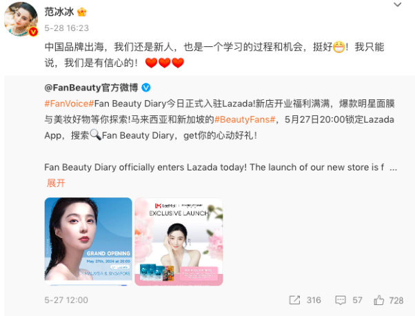 今年五月底,Fan Beauty Diary官宣入驻新加坡和马来西亚的Lazada平台,正式开启品牌出海之路。