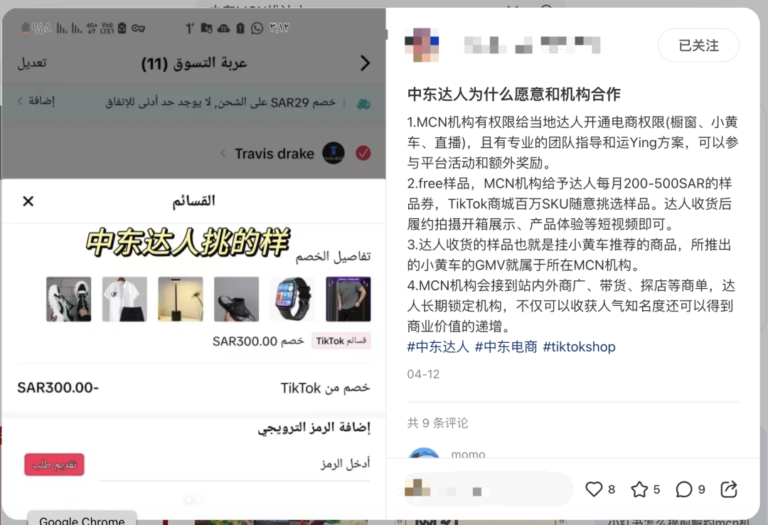 目前TikTok中东地区是全托管模式,TikTokshop负责运营、物流、履约及售后等服务,商家经营链路相对简单,MCN机构的空间比较大。