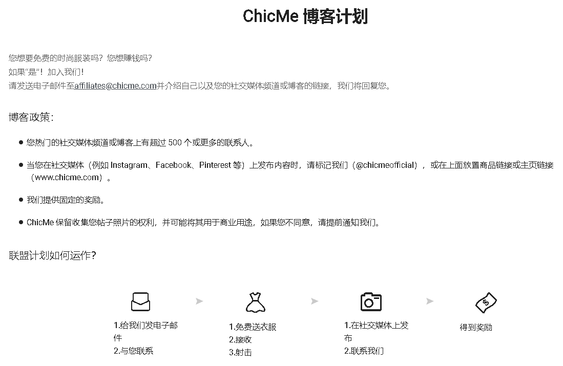 可见粉丝数并非是衡量带货能力的唯一标准,虽然大体量的粉丝数可以为达人提供一定的曝光率,但是否具备带货能力,更多还是取决于达人与粉丝之间的互动质量、内容的吸引力、产品的转化率以及产品与达人形象的契合程度等因素,很多时候,我们应该通过分析这些数据来预估达人的带货潜力和实际效果。像 ChicMe 与 @sarahyoga785 这位博主就是一个很好的互相成就的案例。 不限于主动寻求与达人的合作, ChicMe 还开发了一项“ ChicMe 博客计划”,只要满足粉丝数在 500 以上条件的中小型网红就可以发送电子邮件至官方, ChicMe 将免费赠送样衣,只需要在社交媒体平台上发布内容并@官方,或是在上面放置商品链接或主页链接,即可领取 ChicMe 提供的奖励。通过博客计划,ChicMe 希望能够为用户提供更多有价值的内容和信息,进一步增强与用户的互动和连接,提升用户的品牌认知和忠诚度。