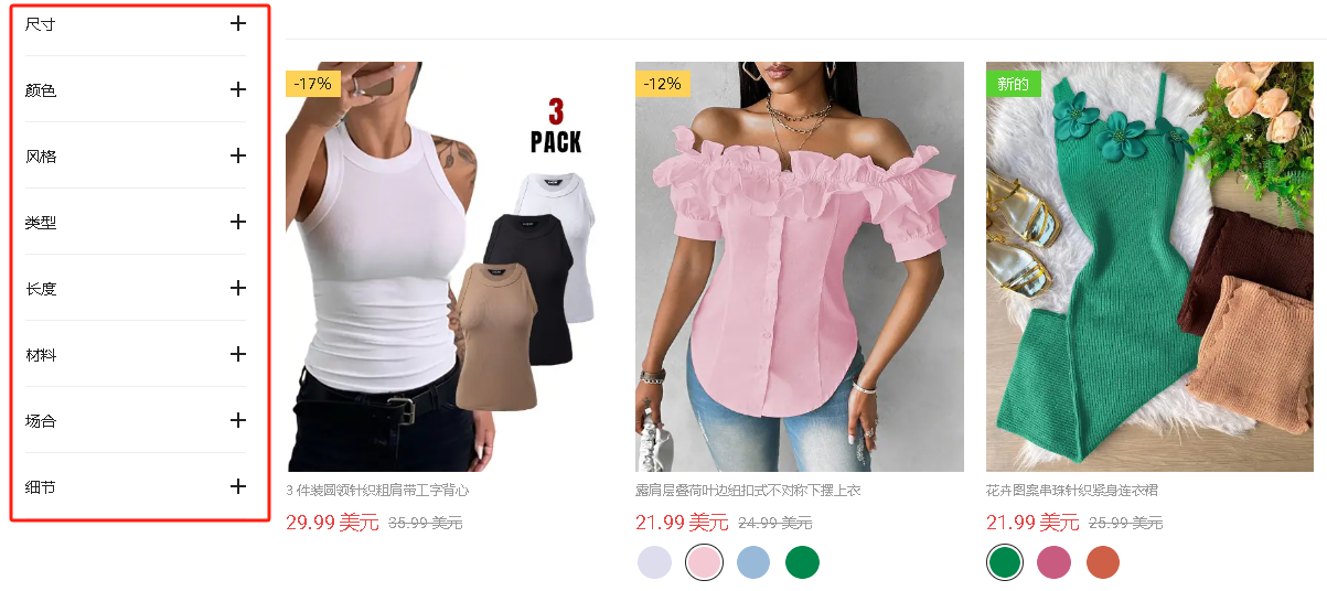 在具体的分类中,消费者还可以通过左侧的筛选功能对衣服的尺寸、颜色、版型、风格、长度、面料、场合等细节做进一步的筛选和选择,这些细化的筛选功能,能让消费者更精准更快速地找到符合自身需求的服装产品,购物体验大大提升。而产品详情页里高质量的产品图片、清晰的尺寸指南,真实的客户评论,也能让购物者做出明智的购买决策,最大限度地降低买家后悔的风险。 通过网站设计、内容编排等方式,ChicMe 营造出其独有的视觉风格和品牌氛围,突出的产品特色,在浏览、搜索、下单等环节的流畅体验以及用心的客户服务,也在无形中增强用户对品牌认知度和忠诚度。04