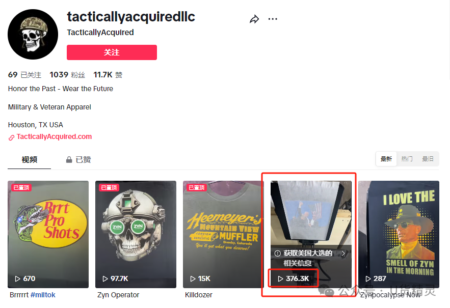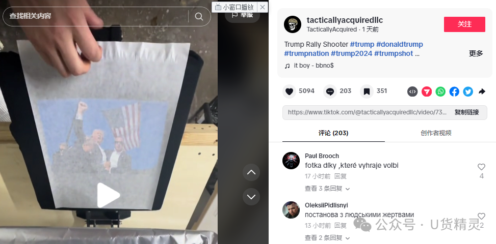 TikTok账号@Tactically Acquired的Trump Shooting T-Shirt挂车短视频播放量高达37.63万播放,5000+点赞,挂车销量已突破2300+
