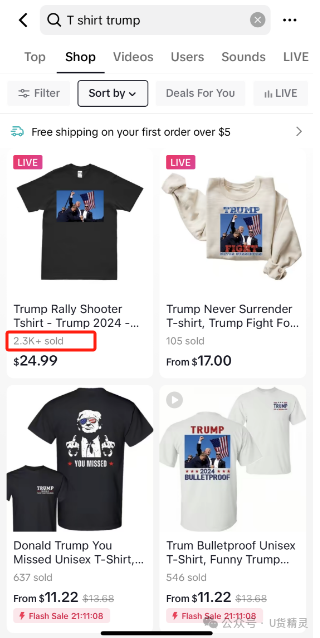 有多个商铺开播在TikTok上售卖特朗普周边T恤,其中一名主播的T恤销量更是在短时间内破百,原价14.99美元的商品后涨价10刀又售出了上千件。