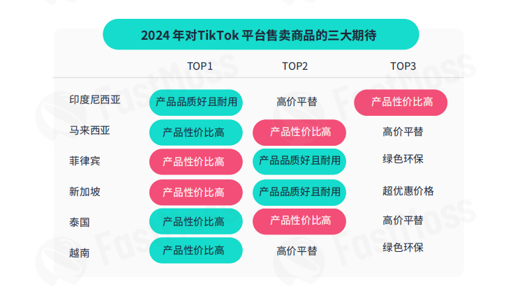 东南亚消费者非常务实,打动他们的购买因素主要是营销因素(促销活动)和价格因素(性价比高/质量好)。聚焦TikTok平台,东南亚消费者的期待集中在产品质量耐用和性价比高这两点。