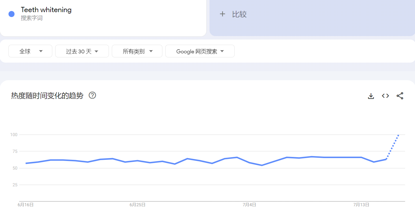 根据谷歌趋势显示,过去30天,全球范围内“Teeth whitening”(牙齿美白)搜索热度持续在50—75之间,且预测将持续上涨至100。 其中,爱尔兰、澳大利亚、英国、新西兰、美国、韩国等国占主要搜索量;“snow teeth whitening strips”(雪牙齿美白贴)、“teeth whitening auckland”(奥克兰牙齿美白)等相关话题热度分别飙升950%、300%。夏季来临,外出活动增多,牙齿美白和牙齿健康再次出现“小高峰”。