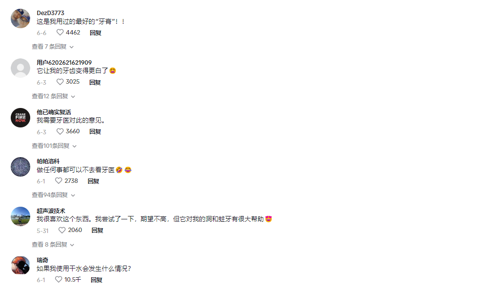 在视频发出后,神奇的护理效果,吸引了一大批用户关注。对此,有用户表示“这款牙膏片是使用过最好的牙膏”、“它让我牙齿变白了”等。