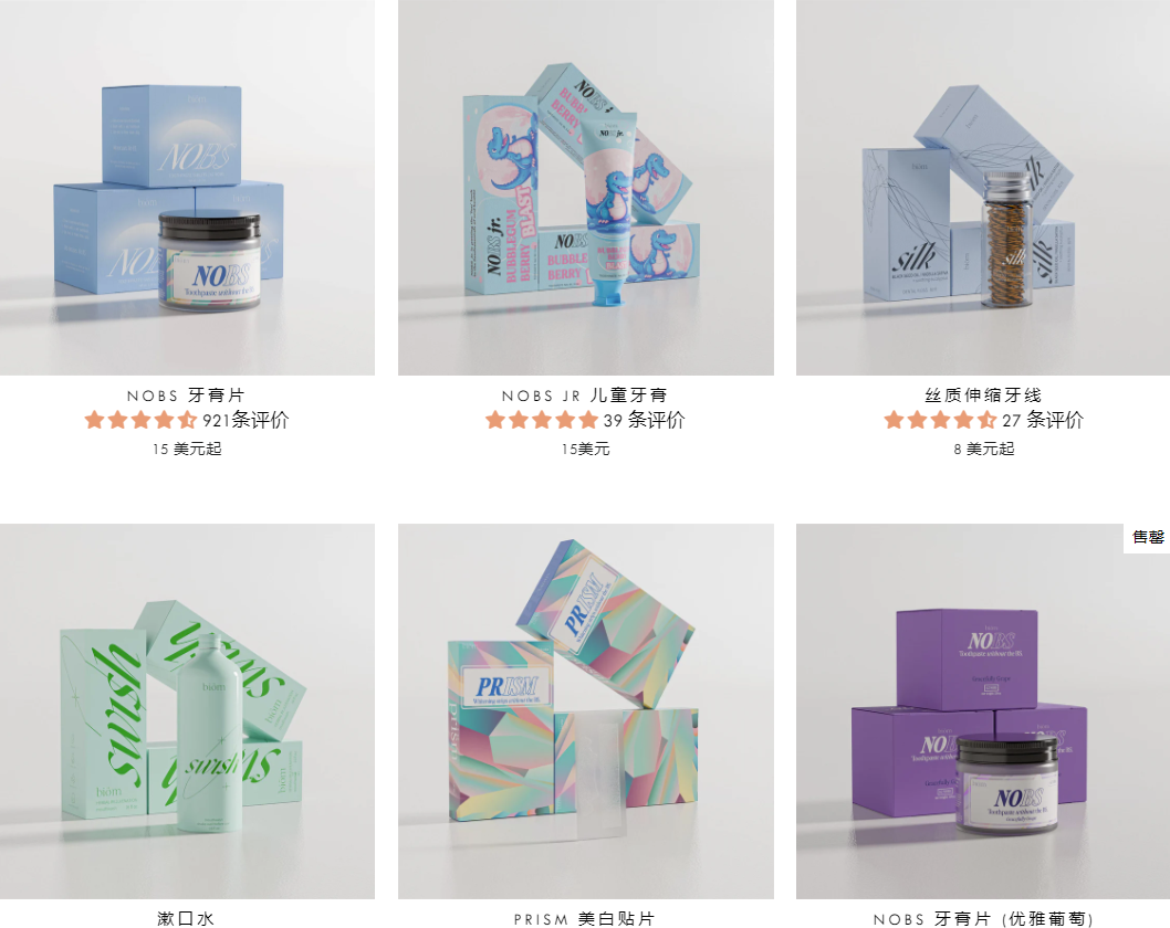 作为专注于个人护理的品牌,biom早就自建品牌独立站,主要售卖口腔护理的各种产品。除了主推的NOBS牙膏片外,还有多款牙齿口腔清洁产品,如:漱口水、美白贴片、牙线等,致力于帮助消费者解决口腔护理问题。