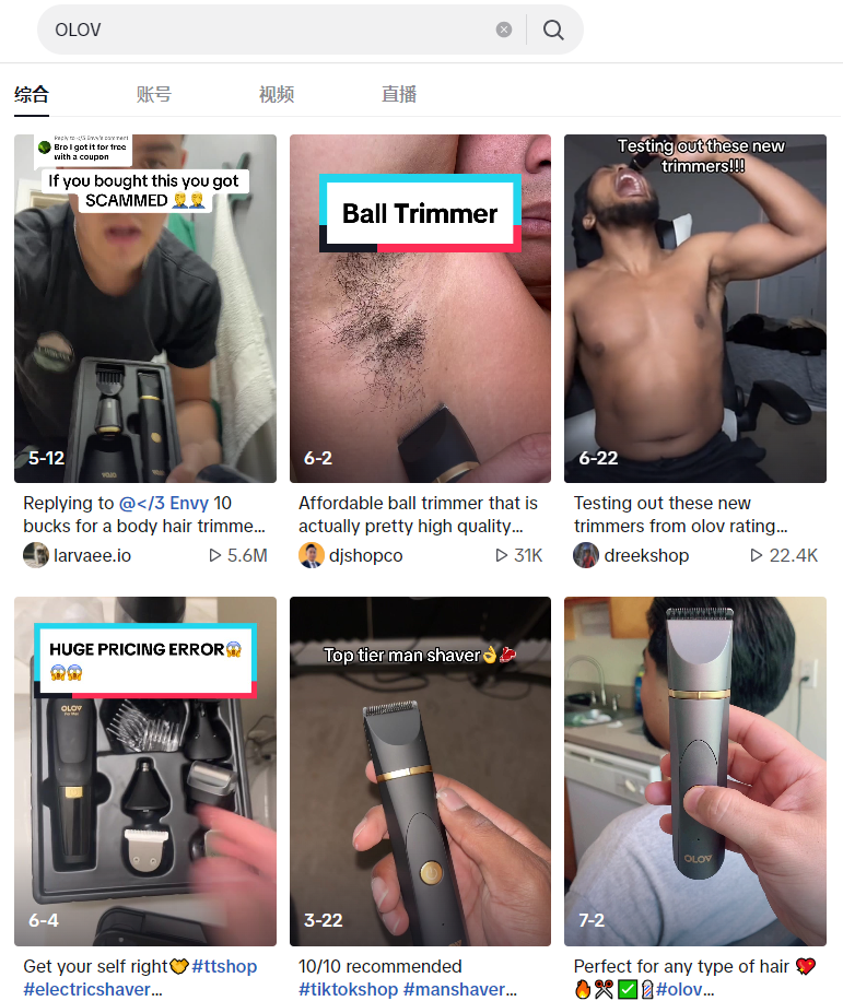 通过搜索商品品牌“OLOV”可以看到相关产品的推广视频。TikTok上关于该产品的视频基本全部为真实测评视频,各类博主亲自上身体验这款修剪器的使用效果。