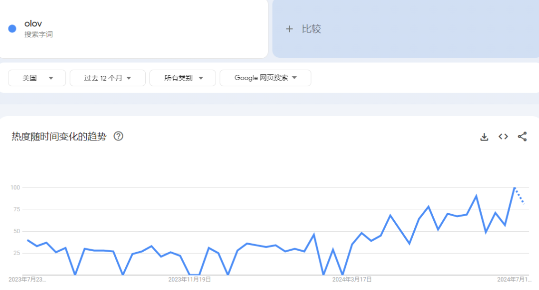 通过Google Trends我们可以了解到一定时期内,产品关键词在搜索引擎上的搜索热度和市场趋势。输入关键词“OLOV”可以看到,美国地区在过去一年里对于这一品牌的搜索程度是逐步升高的,自今年三月份以来,热度逐步逼近顶峰。可以看得出美区消费者对于此类产品的需求程度越来越高。