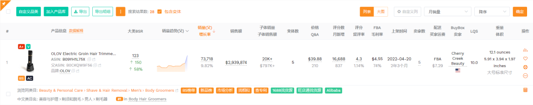 通过卖家精灵可以看到,这款产品拥有74%的毛利率,并且其销售趋势正大幅度上升,销量增长速度也极快速,并且这款产品牢牢占据着 Body Hair Groomers 这一类目榜首。