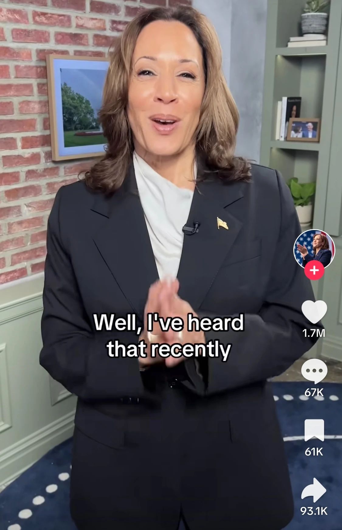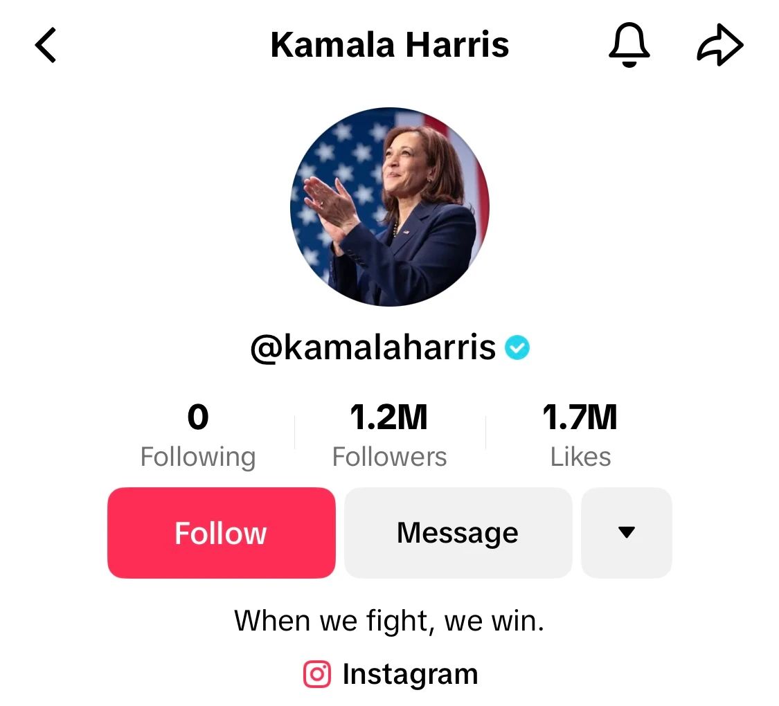 不过日前特朗普新的竞选对手——美国副总统哈里斯也在TikTok 开设了官方账号并发布了第一条本人出镜的视频。哈里斯在她的第一条 TikTok 视频上写道:“我认为该加入队伍了”,并在视频中说:“听说最近我在推荐页面上很火”。截至目前,该条视频已有670万人看过,获得170万的点赞,哈里斯的 TikTok账号已有超120万名关注者。