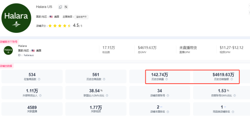 在全球电商巨头亚马逊上,服装类目便是一枝独秀。2021年,服装超越家居成为平台的第一大类目,持续为亚马逊的GMV和利润带来巨大贡献。在新兴社交电商TikTok Shop上,服装类目也屡屡登上销量榜首位置。 在这一红海类目下,正有越来越多的玩家杀出重围。 例如出海运动休闲服装品牌Halara,目前该品牌在TikTok美区开设了4家店铺,其中Halara US的销量自上架至今已经累积总销量超过142万,历史总销售额高达4619万美元,由此品牌被称为“类目榜首”“爆款制造机”等。