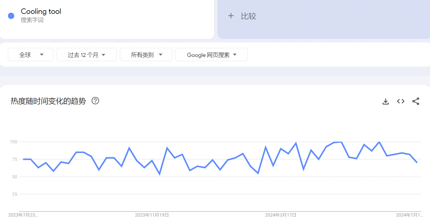谷歌趋势显示,过去12个月,全球范围内“Cooling tool”(降暑神器)搜索热度持续在50—100之间,近期持续在75—100之间。 其中,菲律宾、美国、澳大利亚、加拿大等国占主要搜索量;过去30天,在美国该词热度持续在75—100,热度还将继续走高。 最近,许多网友都在TikTok上分享各类降暑神器。