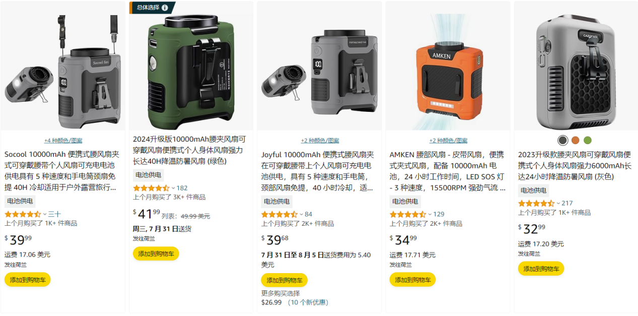 通过搜索发现,亚马逊美国站内,多功能腰夹风扇售价在32.99美元—41.99美元之间,畅销款多功能腰夹风扇上个月爆卖了7000+单,商家承诺发货时间,在详情页中,展示该产品的续航时间、电池容量、使用方式及适用场景等,方便用户搜索购买。
