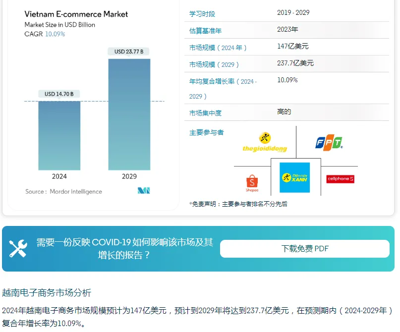实际上,越南电商市场早已展现出惊人的爆发力。据Mordor Intelligence此前发布的报告显示,2024年,越南电商市场规模有望达到147亿美元,到2029年,这一数字或将突破237亿美元。