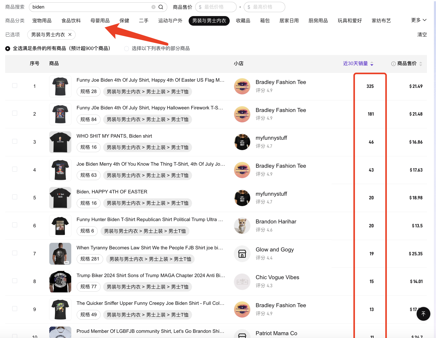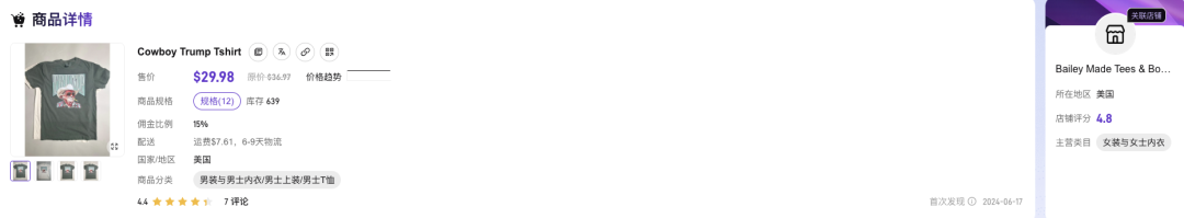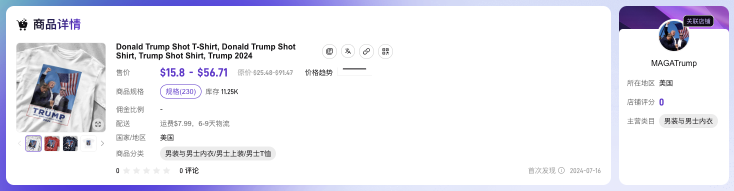 现在,点开你的TikTok页面,主页推送视频要么是巴黎奥运会预热、或者是温网公开赛、抑或是震惊国际的特朗普被枪击事件。TikTok在海外,毋庸置疑地成为了抓取社会热点的兴趣内容社媒平台。就在不久前,特朗普在一次竞选集会上遭遇震惊国际的枪击事件。7月13日,在宾夕法尼亚州的竞选集会上,当时,特朗普正在台上发表演讲,突然枪声响起,现场陷入一片混乱。枪击事件,不仅让特朗普的民意选情发生了转变,现场还拍下了特朗普的“人生照片”。照片一出,全球以“病毒式”的传播速度蔓延在国际上。商业触觉灵敏的美区本土商家,迅速抓取时事热度,连夜用照片定制“特朗普文化衫”,直接冲上本土“男装”热销榜第一名!后面紧跟着的第二、第五、第六名都是相关文化衫。“特朗普耳朵的血还没干,衣服已经卖断货了!”这次事件,又是一个展示流量如何变现的典范例子。特朗普枪击事件后,各大新闻媒体和社媒平台都聚焦在今年的美国大选进程。除了看官方渠道的选调民意数据之外,原来大数据也能预测今年美国大选结果?今天GlodaStory将“斗胆”通过TikTok商品数据预测一波今年美国大选的结果。通过GlodaStory查看TikTok「男装与男士内衣」类目热销榜单,可以发现在7月15日原本销量一般的“Cowboy Trump Tshirt”特朗普文化衫当天销量猛增289件,当日销售额达到8660美金,周销量环比增长达到6515.38%。而特朗普的“人生照片”文化衫在7月14日上架,在昨日日售出75件,日销售额达到3060美金。通过GlodaStory的【细分市场】分别输入关键词“biden”和“trump”(两位总统的名字),数据显示,在「男装与男士内衣」中,已上架特朗普的文化衫有4000件,而拜登的文化衫仅900件,对比近期销量情况,拜登文化衫也远不如特朗普的周边T恤总体销量。