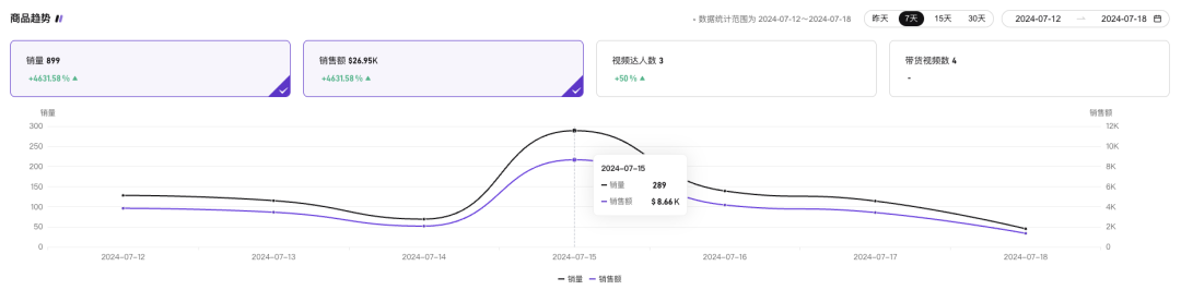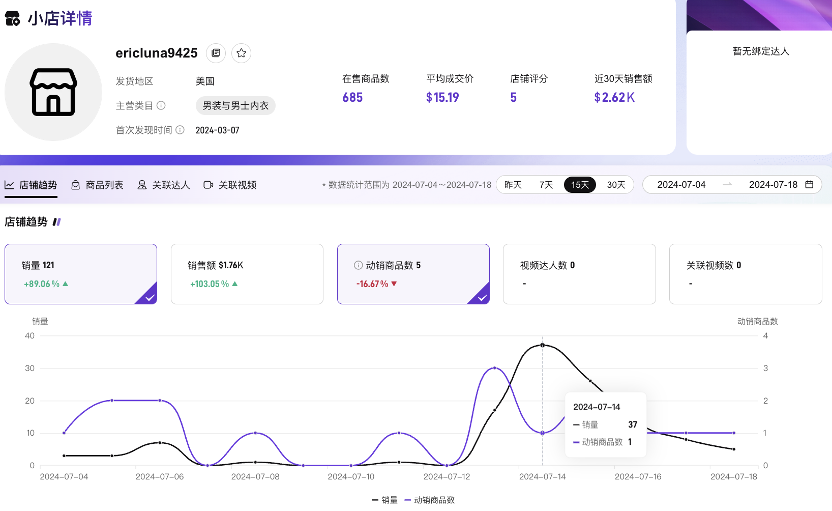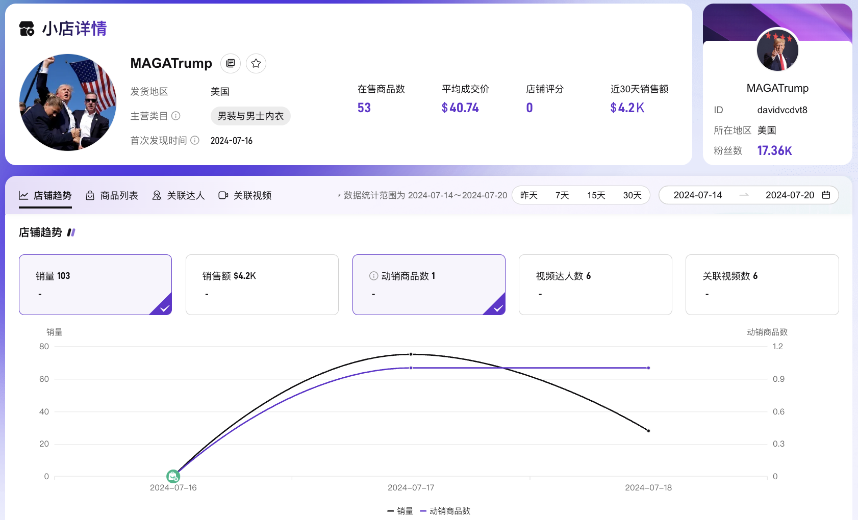从图表中还可以观察到,很多小店都是没有上传Logo图的,这些小店通常是跨境店,这类小店早已开通,但是商家缺少选品和运营策略,或是为了备用,而这次敏锐地抓住了特朗普的热度,在枪击事件后,他们反应迅速,调整店铺在售商品布局,成功通过热点流量带动了商品销量,发布的产品视频也能得到不错的观看量和曝光度。