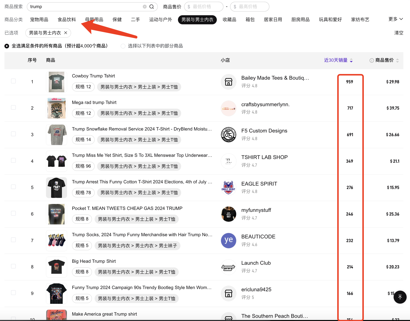 另外,拜登文化衫近30天销量超过1k的产品链接仅4条,反之对手特朗普的文化衫不仅销量爆增,还有种类多样的周边产品,如川币、川旗、狗项圈、文化衫等等,且销量可观。
