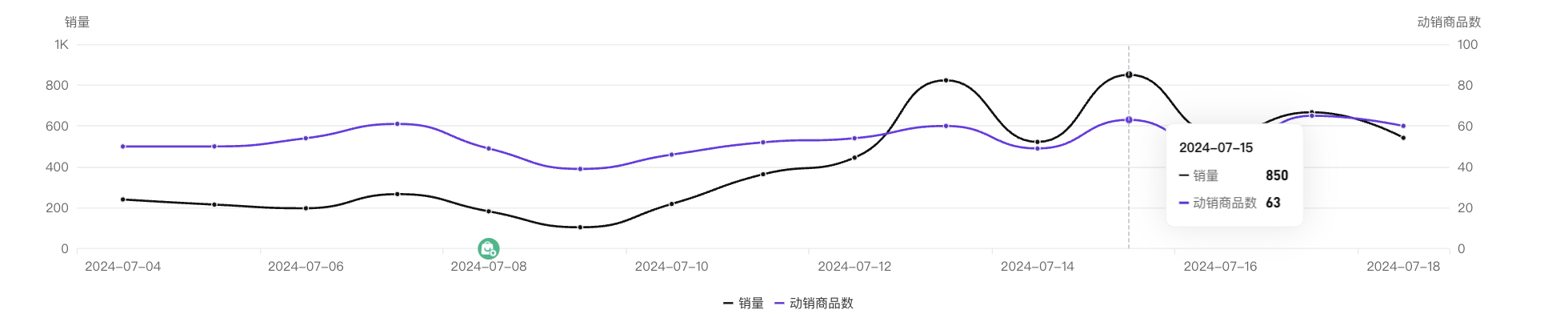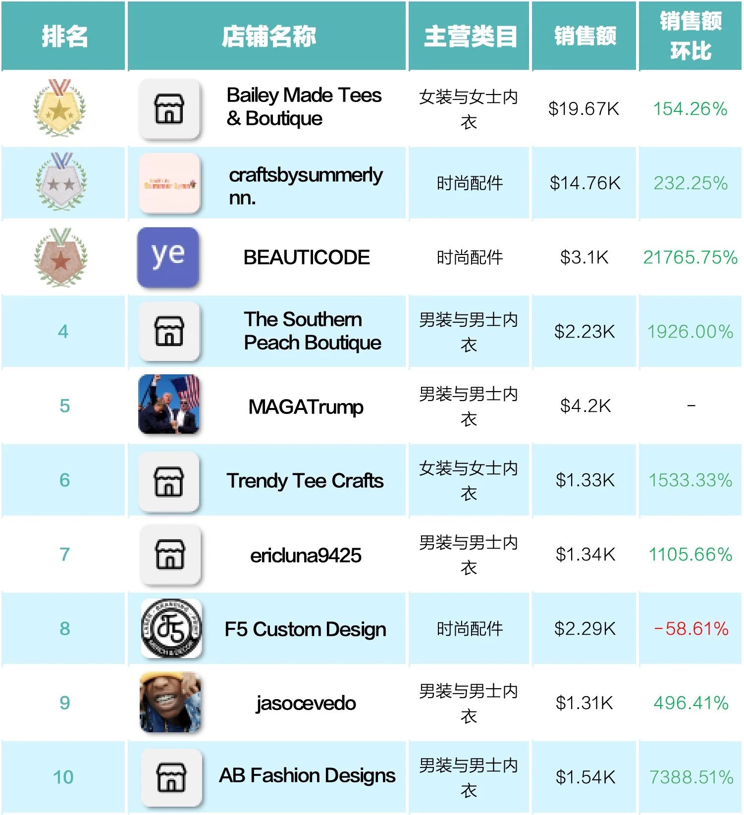 透过对美区TikTok Shop的精细化商品搜索结果得知,哪位候选人的文化衫销量越高,证明他在TikTok的消费群体中越受欢迎,因此他在大选获得的支持度也就越高。另外,在「细分市场 - 店铺分析」板块可以看到,本周(7/14-7/20)许多服装小店蹭上了这波大选热度后,并且根据大选支持趋势上架相关周边产品,大部分都得到了不同程度的销售增长。从图表中可以看到,细分市场的销量Top10小店,榜首是Bailey Made Tees & Boutique这家女装小店,本周小店在细分市场的销售额为1.97万美金,销售额环比增长154.26%。其当周热销商品就是上文提及到的“Cowboy Trump Tshirt”特朗普文化衫。小店近15天的销售高峰分别出现了7月13号和15号,也就是特朗普被枪击事件之后。