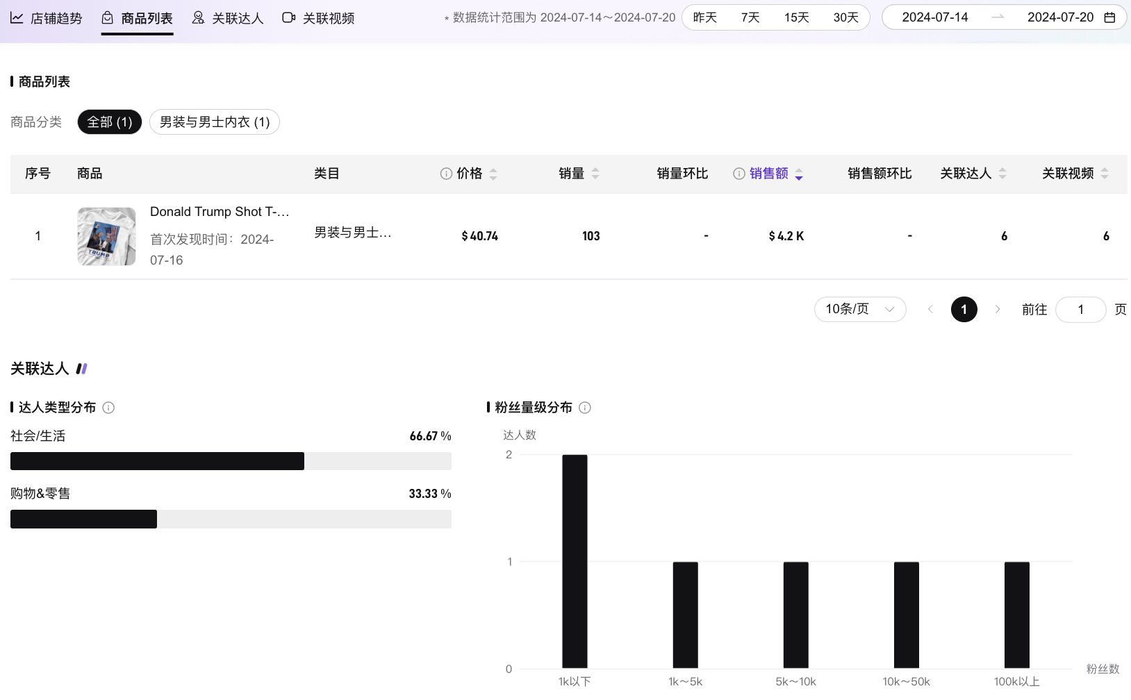 尽管产品上架才几天,就已经得到了达人关注并有6位达人带货,现在这件文化衫已卖出103件,达到了约4.2K美金的销售额。