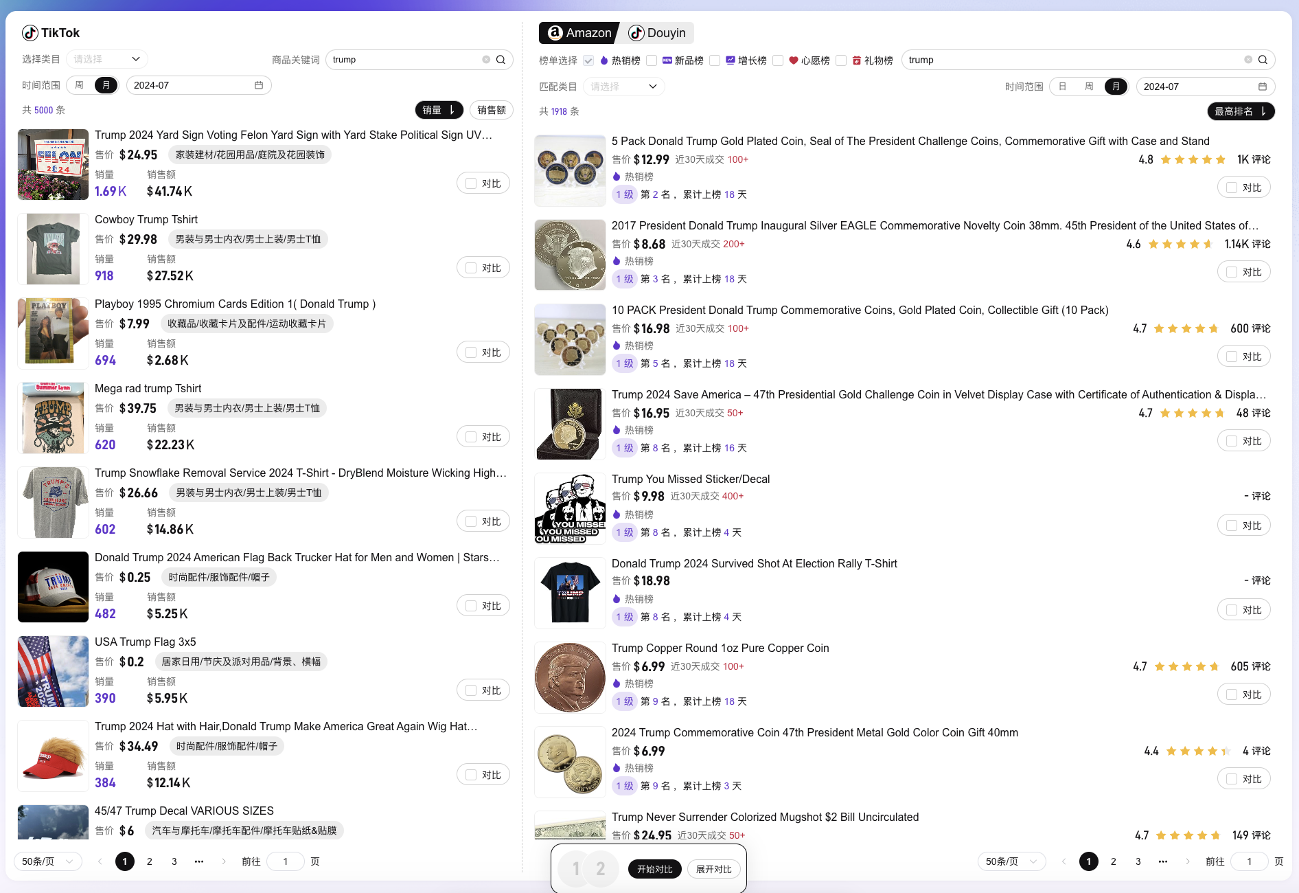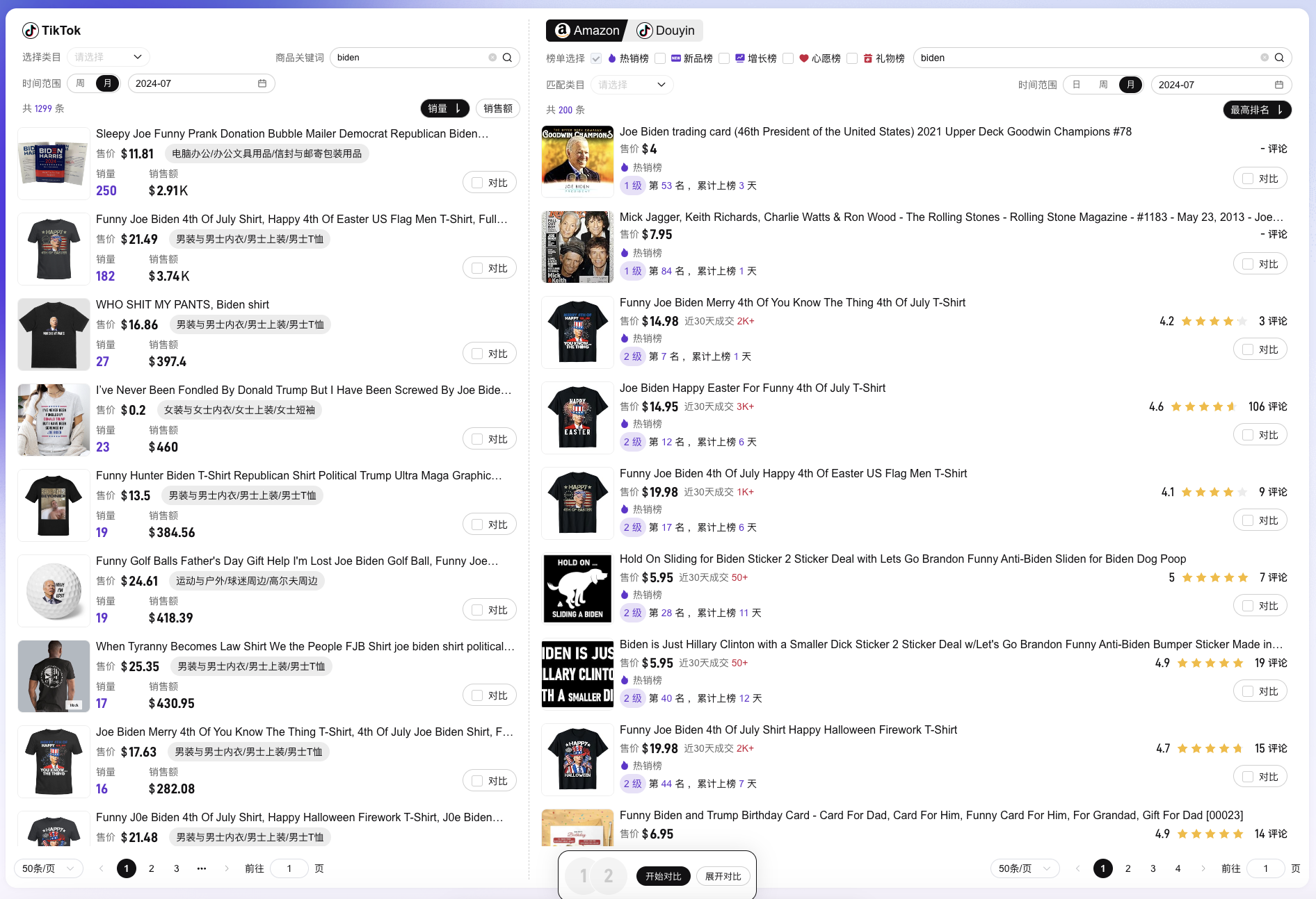由此再次证明,商家应时刻关注当地社会时事热点,通过抓取当前热度上架产品,再结合调整产品营销和视频推广策略,轻松通过TikTok平台实现流量变现。同样的搜索条件搬到GlodaStory的【创意选品】板块,数据显示,标题含“biden”的商品约有1300件,亚马逊仅有195件,而吧关键词搜索换成“trump”,TikTok美区市场则出现了5000件相关商品,亚马逊则有1793件,比拜登多接近10倍。