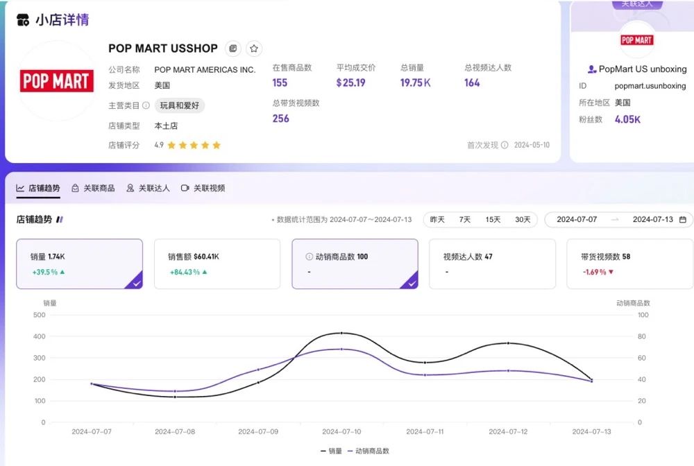 再结合GlodaStory的「细分市场」功能深入洞察玩具市场,可以发现带有"Mystery box"的玩具商品同样在大促当周,该品类均被泡泡玛特商品霸榜,这也反映出,泡泡玛特在盲盒商品类目中已逐步稳定了其在北美的品牌影响力。品牌的知名度逐渐被提高,也少不了TikTok达人的视频合作推广。除了品牌自助联系合作的达人之外,也有越来越多的达人愿意为泡泡玛特的商品拍带货视频。而且该类商品的视频对露脸要求不高,只要在干净的背景和充足的光线情况下拍拆箱视频充分展示商品的细节,视频也会得到不错的播放量。大促当周,就有47位达人愿意为POP MART USSHOP小店的商品带货,而当周关联视频也有58个,视频发布数对比前一周略微减少,这也与泡泡玛特当周的直播计划有关,因此其他商家也可作为参考合理布局视频推广和直播的规划。